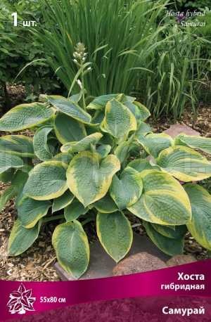 Самурай - высота куста 55 см, ширина 80 см. Листья темно-зеленые с неравномерной золотистой каймой. Цветки бледно-лавандовые.